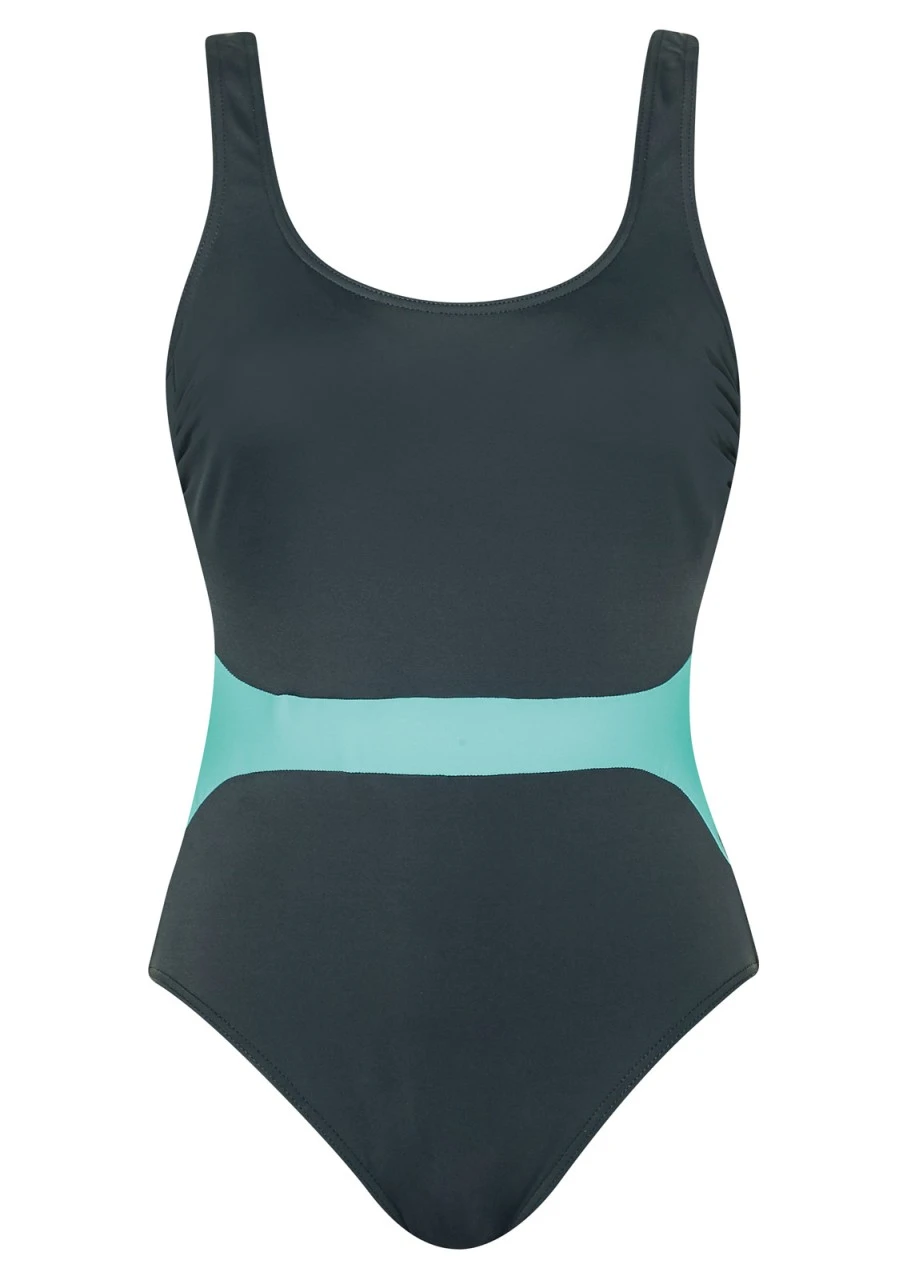 Grau, untermalt mit einem knalligen türkisfarbenen Streifen. Badeanzug mit Softschalen. Der Einteiler ist aus einem speziellen chlorresistenten Material gearbeitet, das der Trägerin lange Freude bereitet.