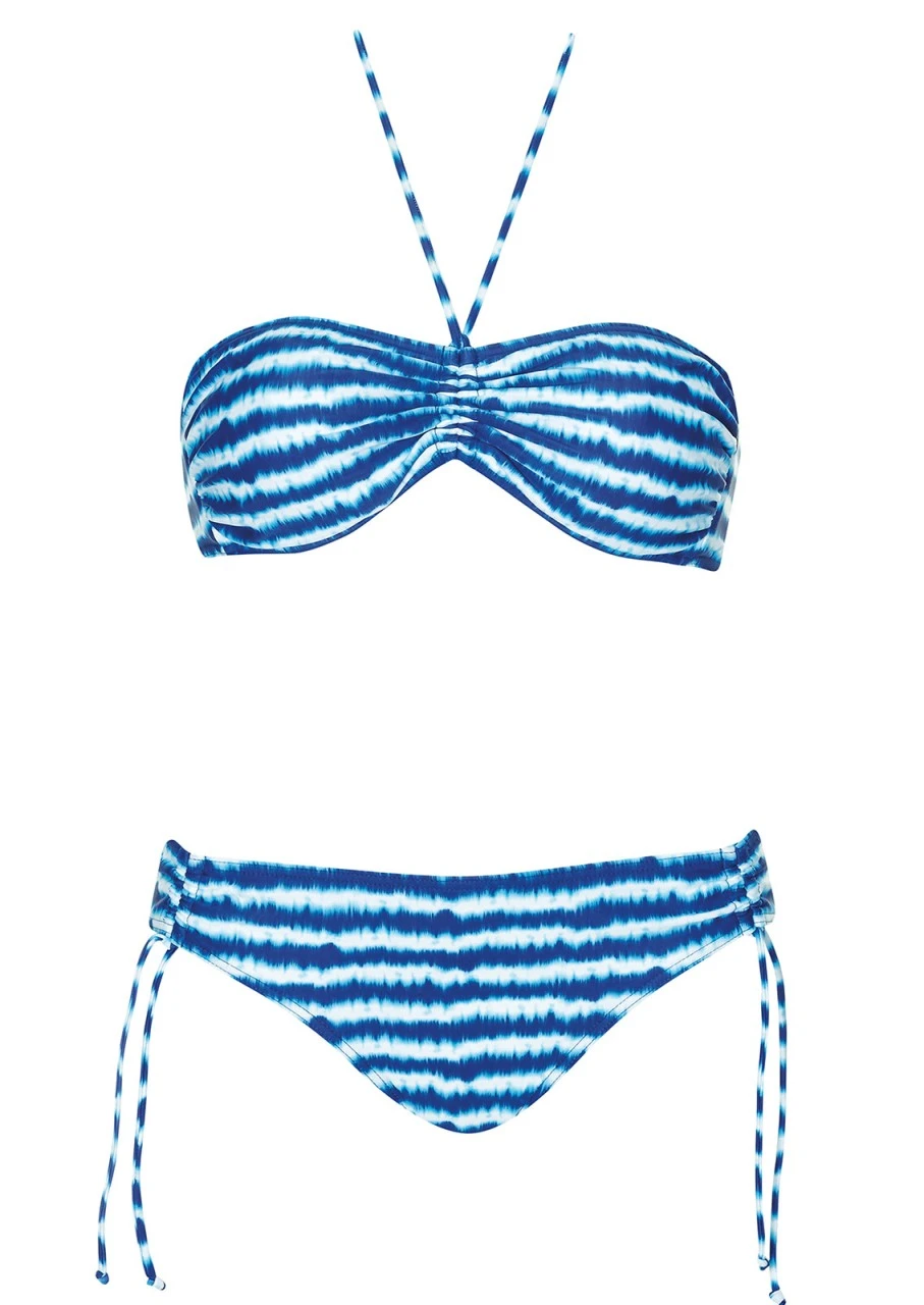Zwei ergänzende Blautöne, kombiniert in einem gerafften Streifenmuster. Das Blau ist nicht nur im, sondern auch außerhalb des Wassers ein Hingucker! Bandeau-Bikini mit herausnehmbaren Softschalen. Der Bikini ist am Rücken zu binden. Der seitlich höhenverstellbare Slip kann an den Seiten gebunden werden.