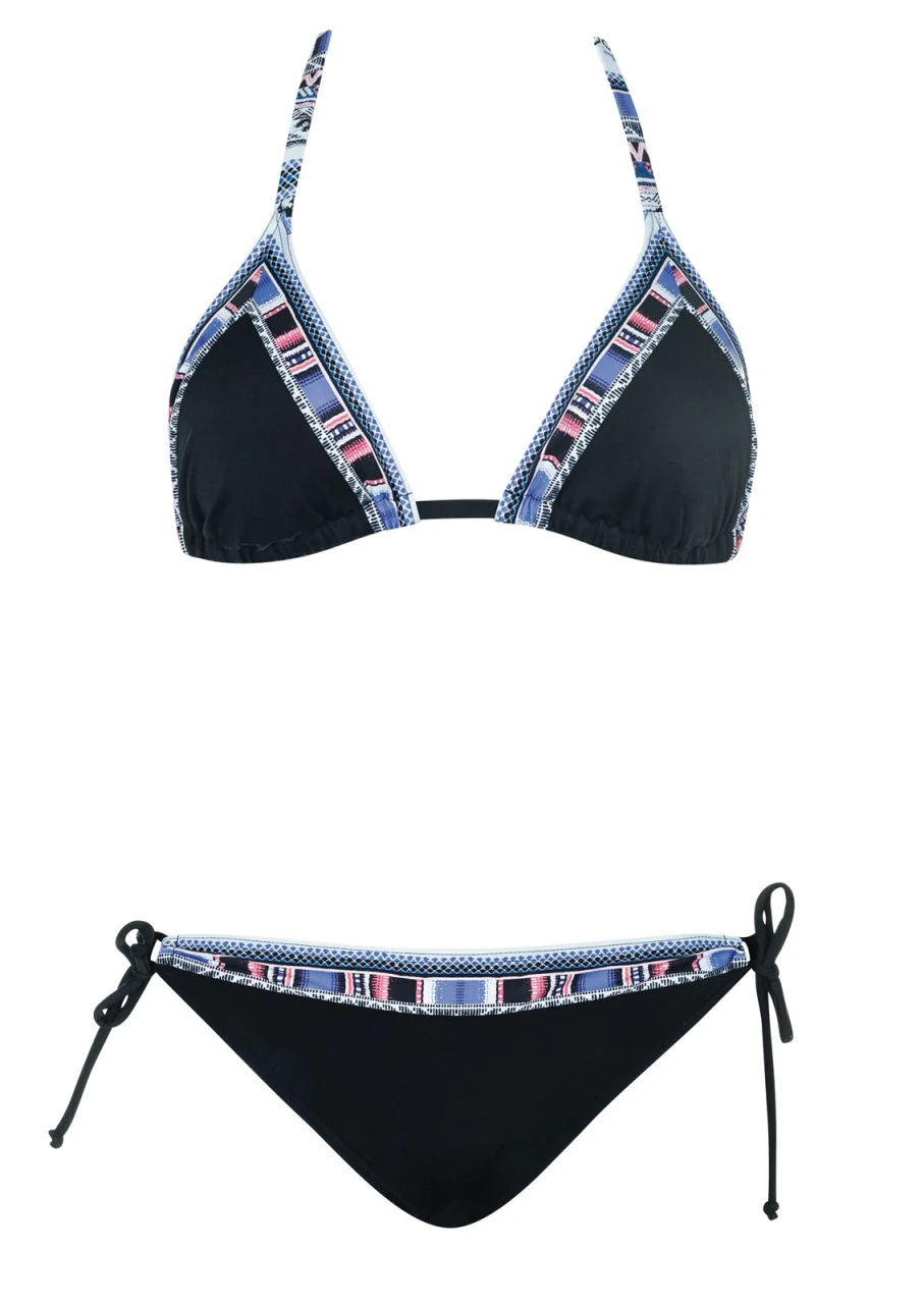 Junges Ethnomuster in Weiß, Blau, Schwarz und Rosa auf schwarzem Grund. Frische Farben für frische Bademode. Schwarzer Triangel Bikini mit herausnehmbaren Softschalen und gemusterten Einsätzen an Top und Slip. Damit beim Liegen nichts stört, ist der Bikini am Rücken mit einem Verschluss zu schließen. Das Top ist im Nacken und der schmal geschnittener Slip an den Seiten zu binden.