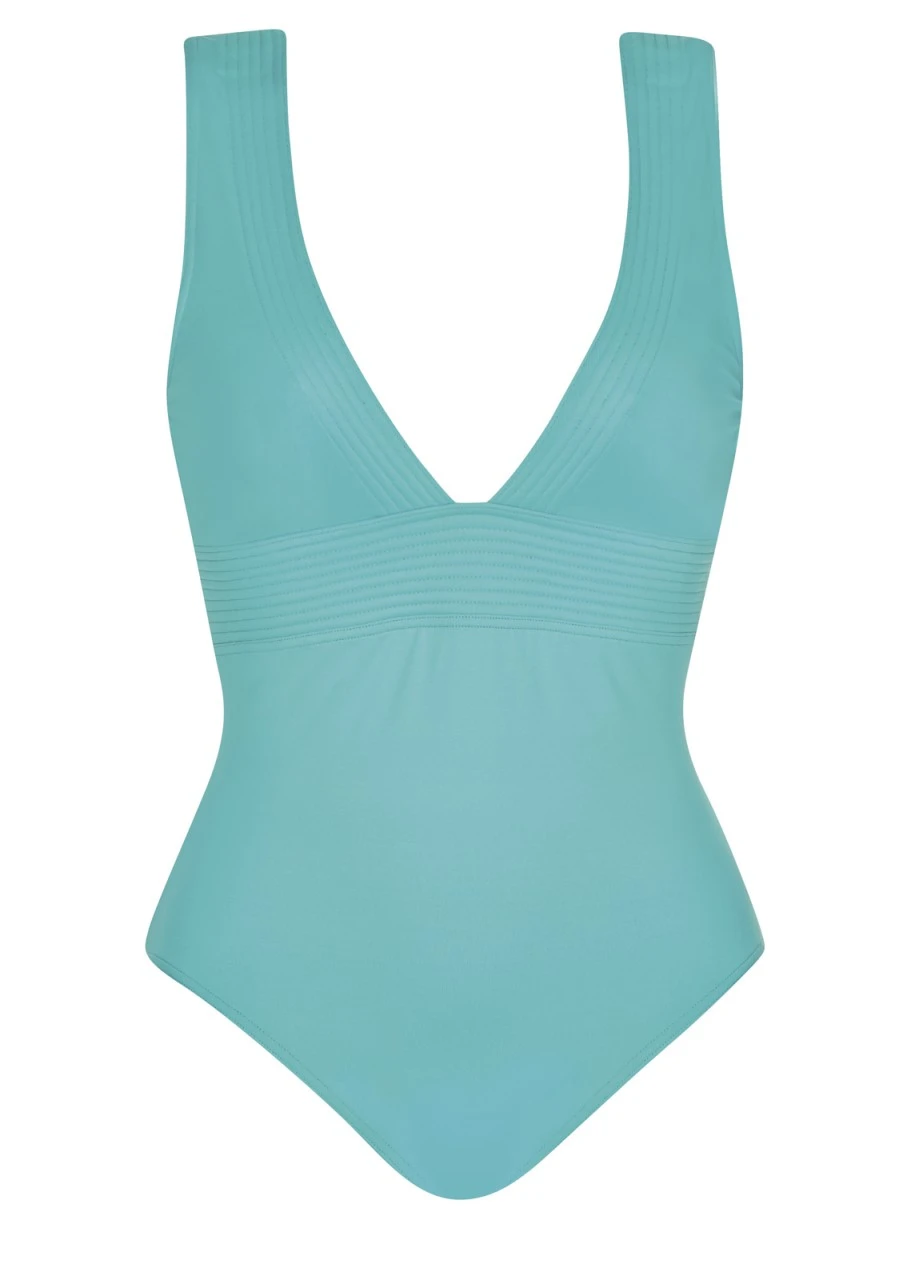 Die pure Eleganz. Unifarbener Badeanzug mit Futterstütze in ebenso unaufdringlicher wie überzeugender Optik. Feine Einsätze mit Rippenstruktur am Dekolleté und an der Taille ergeben ein Design mit Wow-Effekt. Schönes, etwas tiefer ausgeschnittenes Dekolleté. Hoher Rückenausschnitt. Erhältlich ist der Einteiler in schmeichelndem Lila oder klarem Türkis.