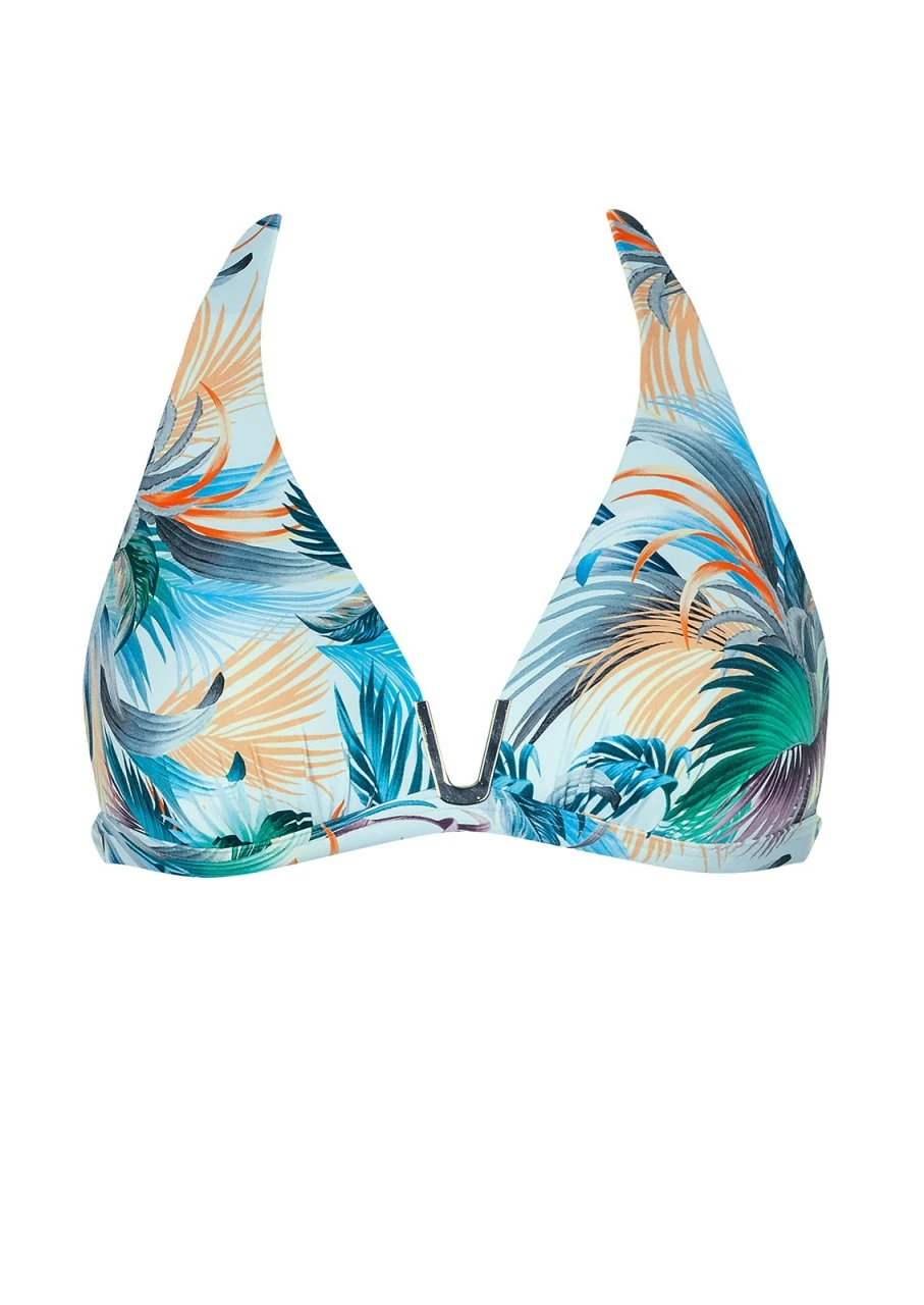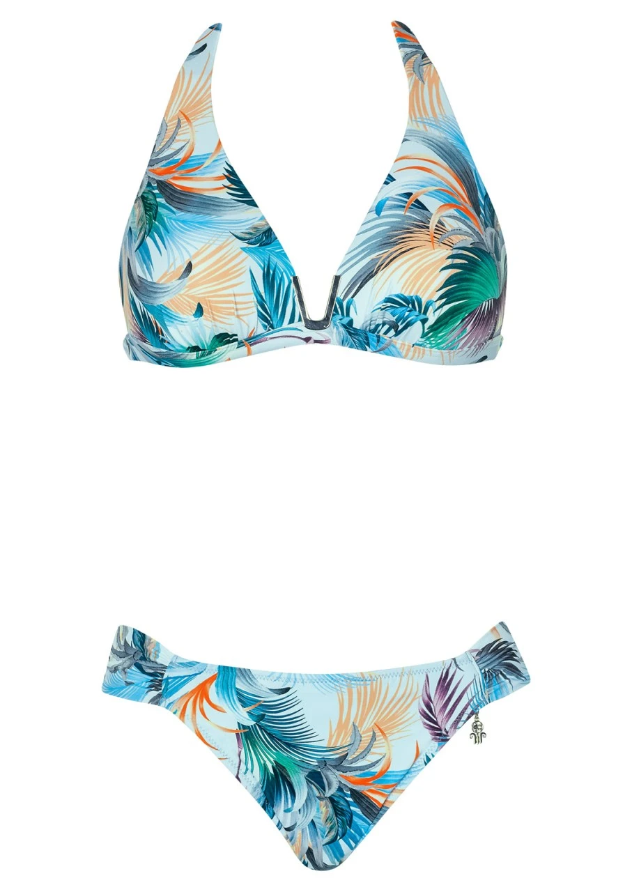 Einfach exotisch! Tropisches Muster auf einem atemberaubend weißen Untergrund. Triangel-Bikini mit Softschalen.