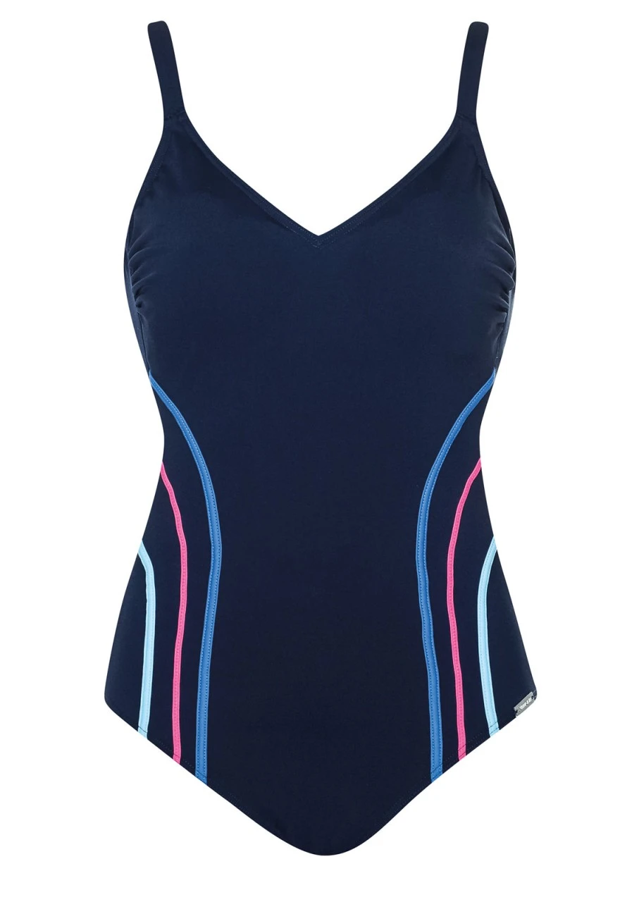 Der perfekte Begleiter für die modische Vielschwimmerin. Sportlicher Badeanzug mit Softschalen. Gekonnt in Szene gesetzt wird Deine Figur durch geschickt platzierte Zierbänder. Der Badeanzug ist zudem aus einem speziellen chlorresistenten Material gearbeitet, das selbst hoher Beanspruchung trotzt und der Trägerin lange Freude bereitet.