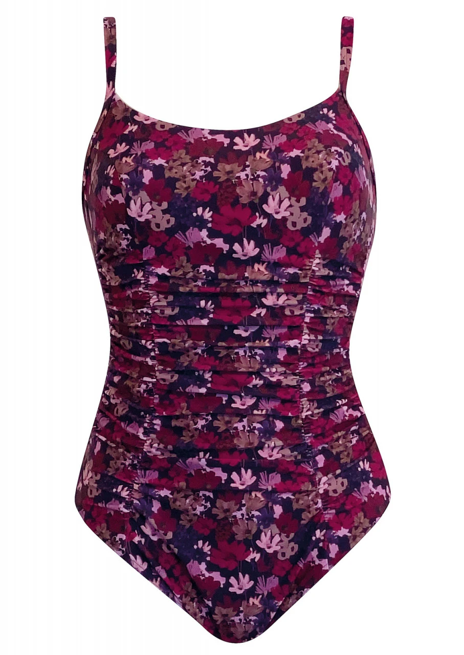 Romantik pur! Traumhaft schöner Mille fleur Blumen-Print. Badeanzug mit Softschalen. Wiener Nähte zieren, für eine figurbetonende und taillierte Optik, die Vorderseite. Im vorderen Bereich und an beiden Seiten gerafft. Die Träger sind verstellbar. Tiefer Rückenausschnitt. Nachhaltige Bademode: OLYMPIA® GOES NEXT LEVEL – Bademode aus recyceltem Material.