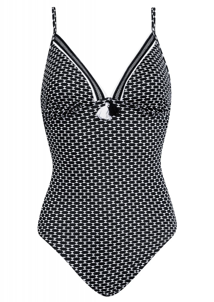 Modern und trotzdem zeitlos! Schönes Grafikmuster in schwarz/weiß. Badeanzug mit Softschalen. Die Träger sind verstellbar und an der Rückseite zum Aushaken. Schöner Abschluss mit Zierband an den Cups und niedliche Zierteile „Pompon“ in der Farbe Schwarz und Weiß am V-Ausschnitt. Hoher Rückenausschnitt. Nachhaltige Bademode: OLYMPIA® GOES NEXT LEVEL – Bademode aus recyceltem Material.