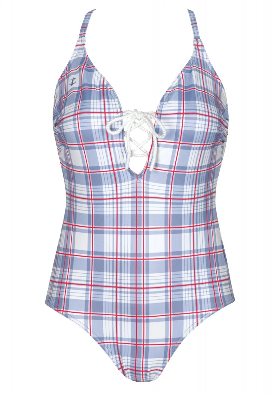 Karo goes Beach. Karomuster in Weiß, Hellblau und Rot. Ein stylisches und gleichzeitig frisches Design. Badeanzug mit Softschalen und einem tiefen Rückenausschnitt. Ein wahrer Blickfang ist das tief ausgeschnittene Dekolleté, das mit Kordel-Bändern gehalten wird. Der kleiner Anker-Print und die Kordel-Bänder verleihen dem Design einen maritimen Touch. Die Träger sind verstellbar und am Rücken zum Aushaken – so entstehen viele Trage-Varianten: Mit geradem Träger, überkreuzt oder im Nacken gebunden. Der Einteiler ist komplett gefüttert. Durch diese Vollfütterung garantiert der Einteiler zusätzlichen Halt und ist besonders blickdicht. Nachhaltige Bademode: OLYMPIA® GOES NEXT LEVEL – Bademode aus recyceltem Material.