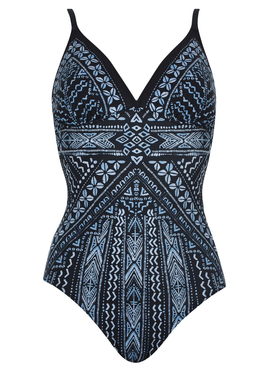 Kräftiges Nachtblau, darauf ein stylischer und zugleich lässiger Grafikprint in Hellblau. Ein trendiger Print für einen coolen Look im und am Wasser. Badeanzug mit Softschalen und einem nachtblauen Abschluss am Dekolleté. Die Träger sind verstellbar und am Rücken zum Aushaken, somit können die Träger auch im Nacken gebunden werden. Ein hoher Rücken rundet das Gesamtbild ab und bietet zusätzlichen Halt. Nachhaltige Bademode: OLYMPIA® GOES NEXT LEVEL – das Polyamid für den Oberstoff ist zu 100 % aus recycelten Fasern.