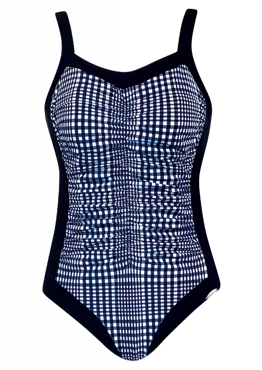 Karo goes Beach. Stylisches Karodesign in Schwarz, Dunkelblau und Weiß – für einen modischen Auftritt am und im Wasser. Mastectomy-Badeanzug mit Softschalen und verstellbaren Trägern. Das höher geschlossene Dekolleté sorgt für einen sicheren Sitz und der Brustansatz bleibt unsichtbar. Beidseitige Taschen ermöglichen das Einschieben der Prothesen und schützen sie vor Herausfallen. Die Raffungen im vorderen Teil schmeicheln der Figur. Der Einteiler ist komplett gefüttert. Durch diese Vollfütterung garantiert der Einteiler zusätzlichen Halt und ist besonders blickdicht. Die Blenden an der Vorderseite und die Rückseite sind in Uni Schwarz gehalten. Tiefer Rückenausschnitt.