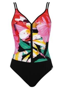 Karo goes Beach. Stylisches Karodesign in Schwarz, Dunkelblau und Weiß – für einen modischen Auftritt am und im Wasser. Badeanzug mit Softschalen und verstellbaren Trägern. Raffungen und das angebrachte Zierband im vorderen Bereich geben eine sehr schöne Optik und schmeicheln der Figur. Der Einsatz im vorderen Bereich und das Höschenteil in der Farbe Schwarz strecken die Figur optisch. Schönes Detail sind die angebrachten Knöpfe am Dekolleté. Tiefer Rückenausschnitt.