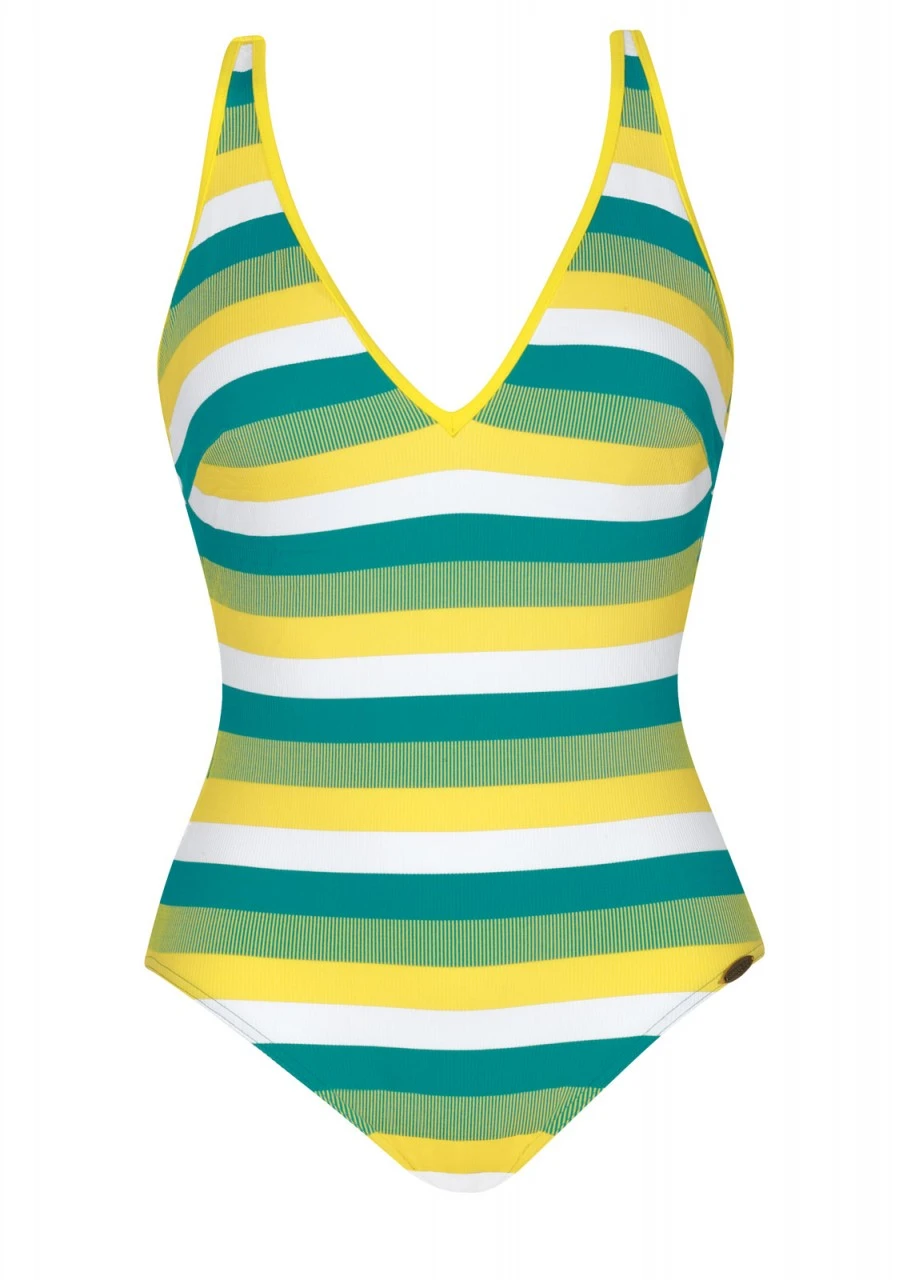 Absolut cool und trendig! Feinripp trifft auf frische Streifenoptik in Zitronengelb, Weiß und Türkis. Eine geniale Optik und unvergleichliche Haptik. Badeanzug mit Softschalen und einem tiefen Rückenausschnitt. Die Träger sind verstellbar und am Rücken zum Aushaken – so entstehen mehrere Trage-Varianten: Mit geradem Träger, überkreuzt oder im Nacken gebunden. Der Einteiler ist komplett gefüttert. Durch diese Vollfütterung garantiert der Einteiler zusätzlichen Halt und ist besonders blickdicht.