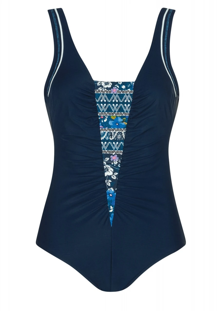 Shapewear-Badeanzug mit Petticoatstütze und einem tiefen Rückenausschnitt. Der Einteiler in der Farbe Blau ist mittig im Vorderteil leicht gerafft und mit einem gemusterten Einsatz versehen. Genialer Badeanzug aus einer besonders festen Stoffqualität. Formt sanft den Körper und unterstützt die Figur – auch dank des raffinierten Dessins. Ein toller Figurschmeichler!