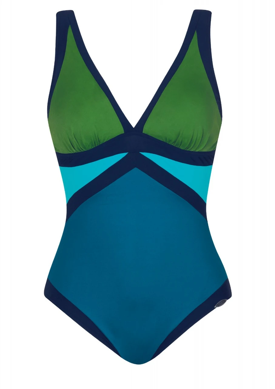 Prächtiger Farbmix! Ein genial angeordnetes Color Blocking Design in atemberaubendem Nachtblau, Türkis, Grün und Blau. Top modern und Figurenschmeichler in einem. Badeanzug mit Softschalen. Die Träger sind verstellbar und am Rücken zum Aushaken. Die Rückseite des Einteilers ist in der Farbe Nachtblau gehalten und hat einen hohen Rückenausschnitt.