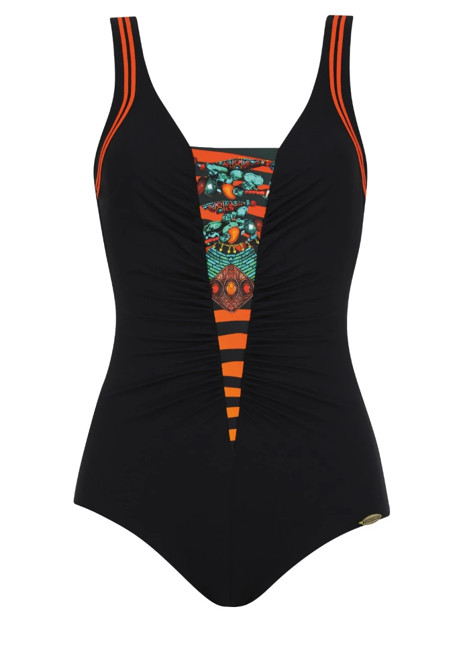 Zauberhafter Figurschmeichler! Schwarzer Shapewear-Badeanzug mit einem tiefen Rückenausschnitt. Die eingearbeitete Petticoatstütze formt und stützt sanft die Brust. Der Einteiler mit Zierbändern an den Trägern ist mittig im Vorderteil leicht gerafft und mit einem gemusterten Einsatz in kräftigem Orange versehen. Der Badeanzug aus einer besonders festen Stoffqualität formt sanft den Körper und unterstützt die Figur – auch dank des raffinierten Dessins.