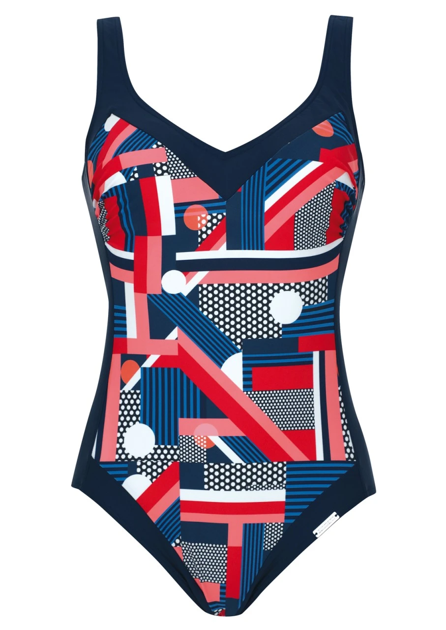 Kreative Kombination aus Farbe – Streifen – Punkte. Aus diesen drei Elementen ist ein sensationelles Grafikdesign entstanden: Top-modisch, auffallend und dennoch in Dessin und Schnitt für jede Frau gut tragbar. Badeanzug mit Softschalen. Die eingearbeitete Halbcorsage rückt Ihre Figur mit optimal stützender und formender Funktion ins rechte Licht. Die Blenden an der Vorderseite und die Rückseite sind in kräftigem Nachtblau gehalten. Der tiefe Rückenausschnitt lädt zum Sonnenbaden ein.