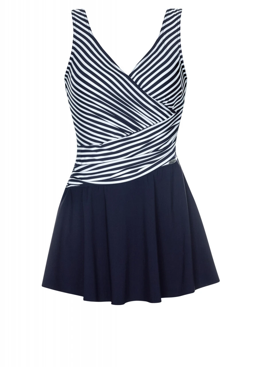 Ein Klassiker im maritimen Look: Nachtblauer Hintergrund mit weißen Querstreifen. Immer aktuell, immer schön! Badekleid mit Softschalen, schön drapiertem Oberteil und tiefem Rückenausschnitt. Ein zauberhafter Einteiler für alle, die es etwas dezenter mögen. Das angesetzte Röckchen in der Farbe Nachtblau kaschiert und verleiht Sicherheit.