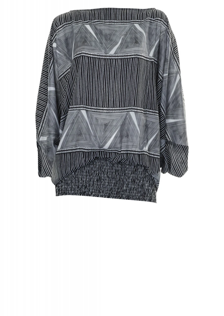 Cooler Grafikprint in Schwarz/Weiß. Modische Multistyle-Bluse mit einem weiten, modischen Schnitt, breiten Bündchenabschluss, Fledermausärmel und Rundhalsausschnitt. Durch den gerüschten Gummizug kann die Bluse auch als Minikleid getragen werden. Ein durch und durch stylisches Cover-Up.