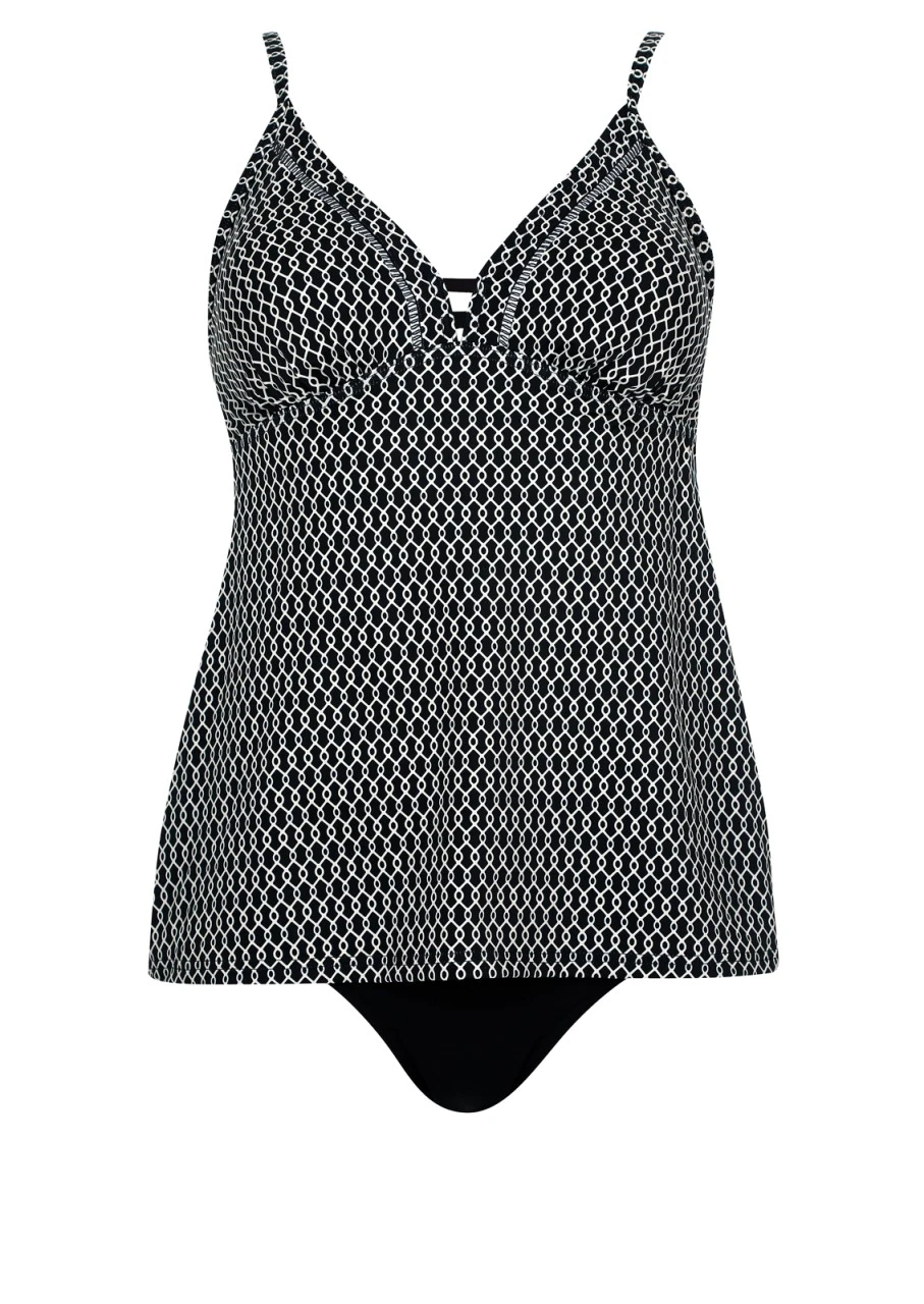 Verführung in Schwarz! Edles Schwarz kombiniert mit einem weißen Kettenprint zaubert eine faszinierende, stilvolle Optik. Tankini mit herausnehmbaren Softschalen. Der schöne, etwas tiefer ausgeschnittene V-Ausschnitt wird mit zwei Bändern gehalten. Die Träger sind verstellbar und am Rücken zum Aushaken, somit können die Träger über Kreuz getragen oder im Nacken gebunden werden. Der schwarze Taillienslip mit breiter Seitenhöhe vervollständigt das Set. Nachhaltige Bademode: OLYMPIA® GOES NEXT LEVEL – das Polyamid für den Oberstoff ist zu 100 % aus recycelten Fasern.