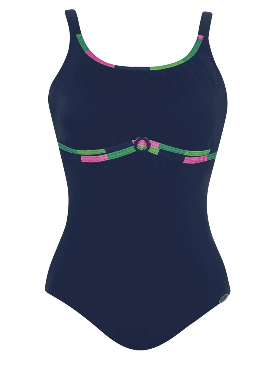 Tiefes Blau, fein eingefasst von grünen und pinkfarbenen Linien unter der Brust und am Dekolleté. Mastectomy Badeanzug mit Softschalen und verstellbaren Trägern.